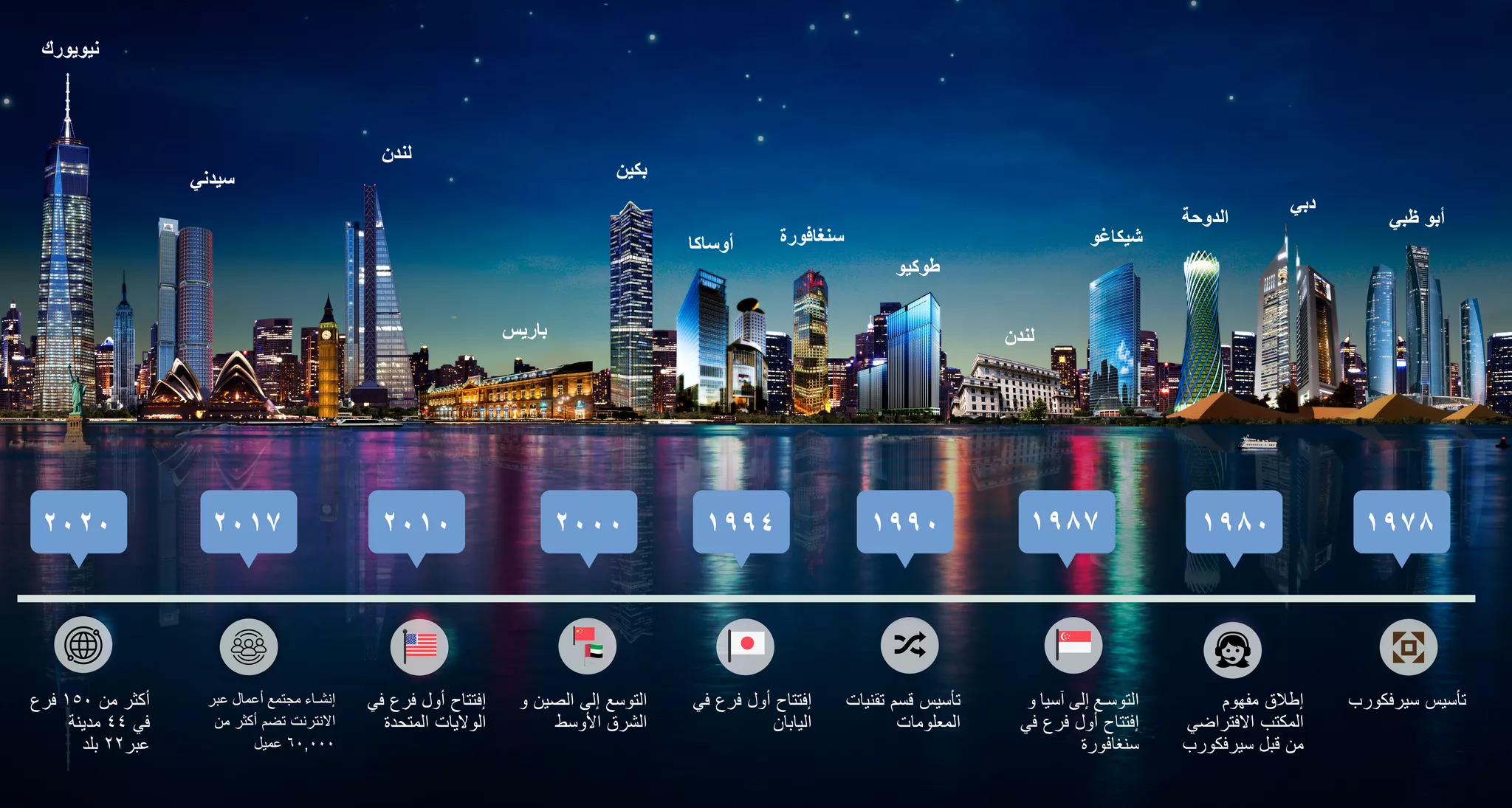 واليوم، دفعت روح الريادة التي يتمتّع بها السيد ألف مفرج وشغفه بسيرفكورب إلى تقديم المكاتب المجهزة للعمل، المكاتب الإفتراضية، وحلول المساحات المكتبية وتكنولوجيا المعلوماتية في ١٥٠ موقع في ٤۱ مدينة على امتداد ٢۰ بلد