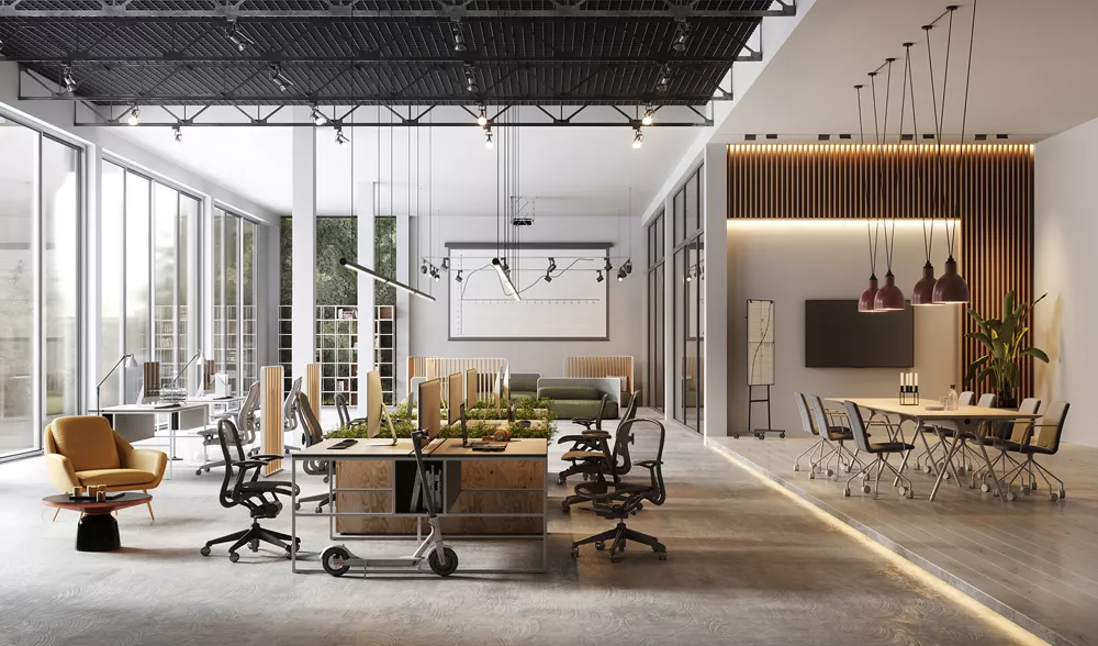 يساعد الأثاث المريح الموظفين على الحفاظ على الإبداع والسعادة وغزارة الإنتاج، وهذا الأثاث يشمل طاولات إعداد المشاريع ومكاتب العمل في وضع الوقوف ومكاتب العمل الطولية المزودة بالمقاعد وكبائن الهاتف المعزولة.